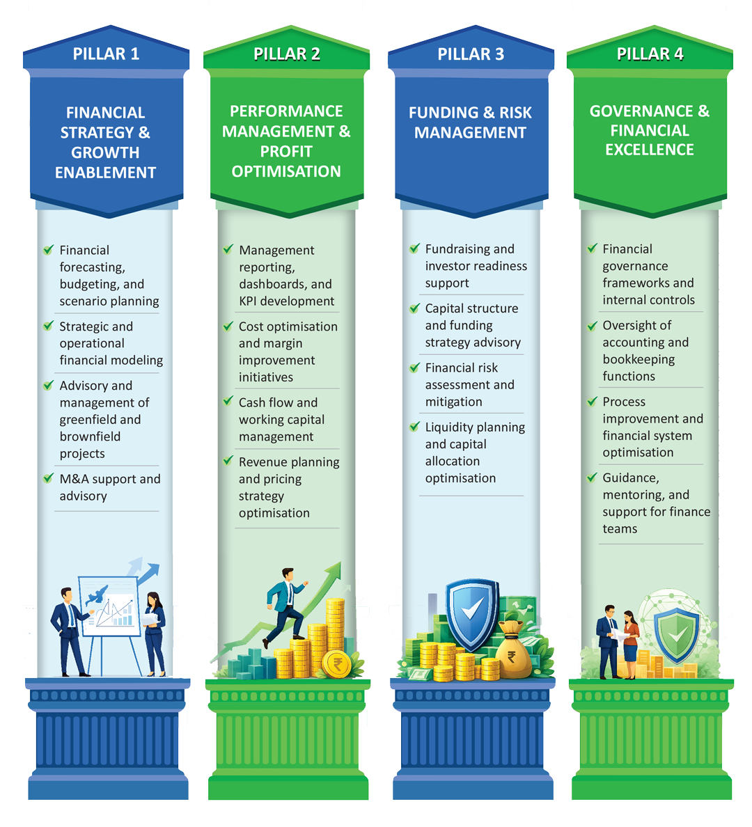 Our advisory services are built around a four-pillar framework designed to address the financial and strategic priorities of growing organisations.